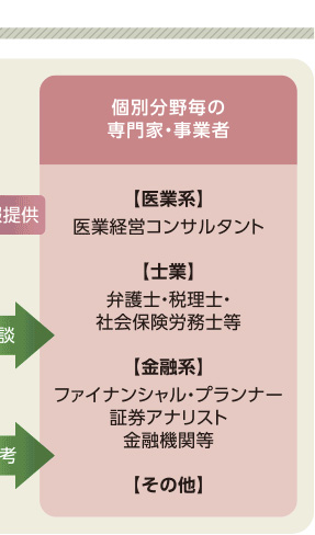 士業の方など外部の専門家と連携しています。全医経が課題を整理し診断した上で、信頼できる最適な専門家を紹介し、協働して問題解決にあたります。医療の病診連携のイメージです。