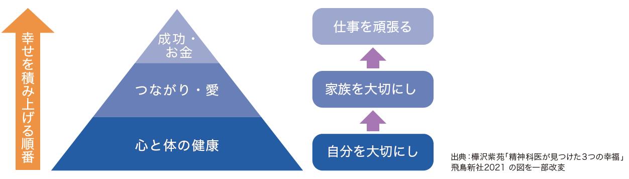 医療機関において、感染リスクを避けるために家族との生活もままならず、長時間働いた見返りに、特別な賞与を出したり、昇進を提示したりしたとしても、一時的な満足による効果があっても、長期間に亘って同様の方法が通用するとは思えません。「心と体の健康」や「つながり・愛」による幸せを積み上げるための組織的な取組が必要だと思います。