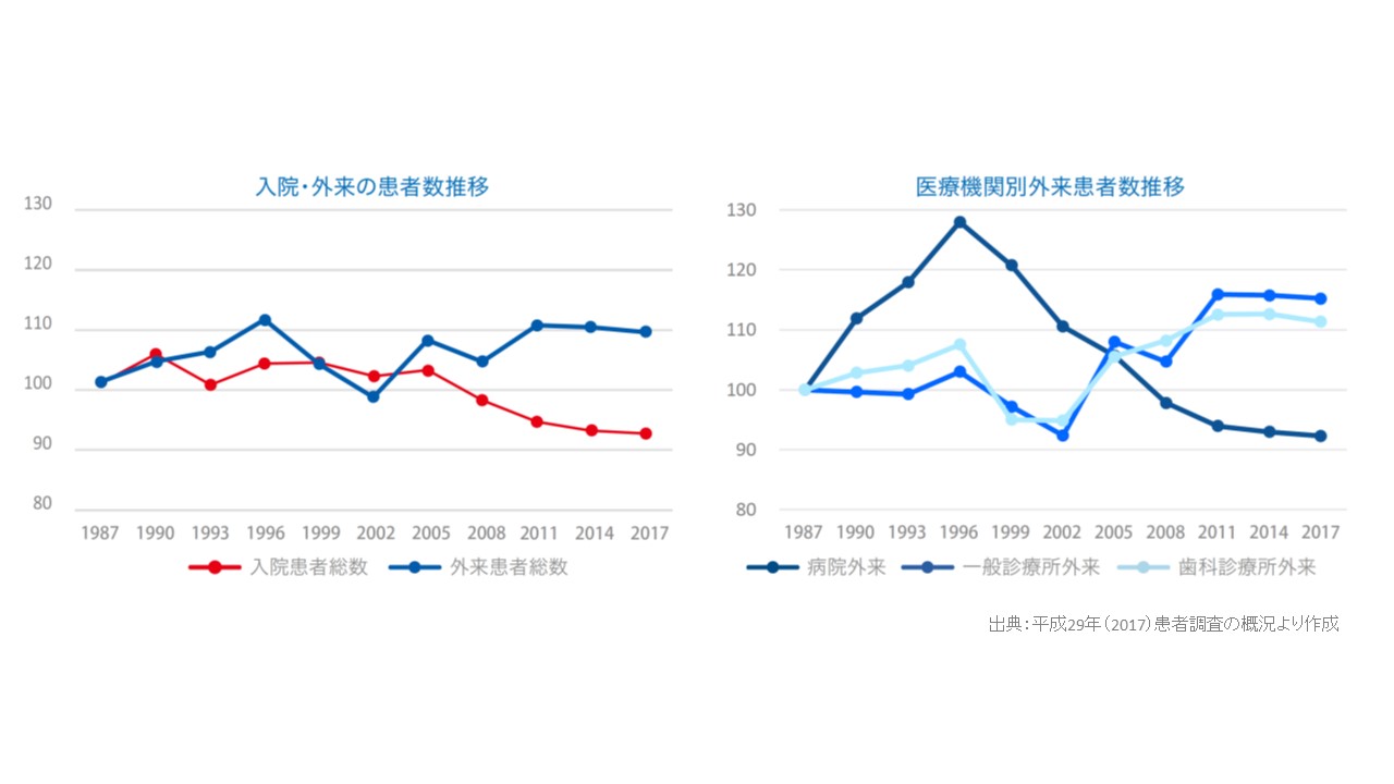 かなり以前から医療需要は供給が作り出すといわれており、医療費を抑制するために、入院については医療計画による病床の総量規制や、平均在院日数の短縮が進められました。一方で外来に関しては、病院から診療所への患者のシフト、処方期間の長期化以外に効果的な対応は取られていません。結果的に過去30年間、入院患者数は減少していますが、一般診療所と歯科診療所の外来患者数は増加傾向です。