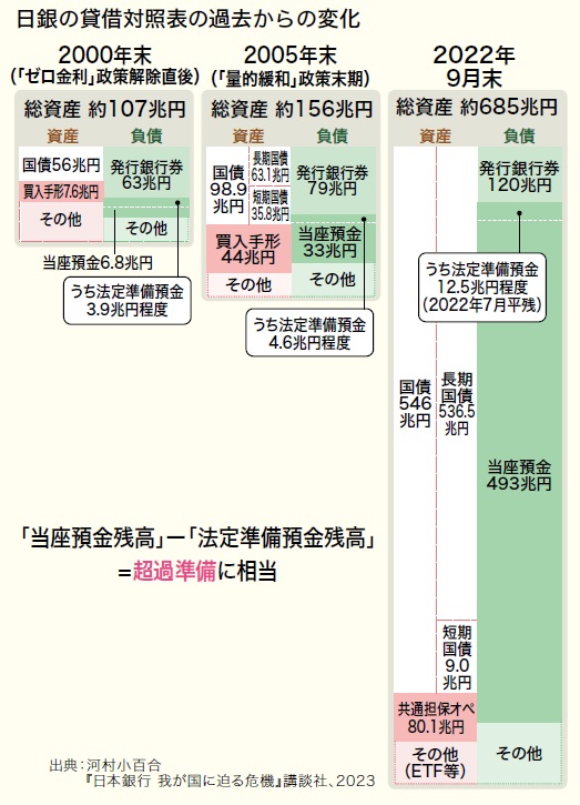 日本銀行の経営状況についてほとんど報道されていませんが、非常に危うい状況です。下図は日銀の貸借対照表の過去からの変化です。2000年代と比較して、2022年は総資産規模が異常に膨らんでいることがわかります。膨らみの最も大きな要因は、国債の買い入れによるもので、2022年9月末は546兆円。同時期の政府の普通国債の発行残高は過去最大の約994兆円、半分超を日銀が保有していることがわかります。