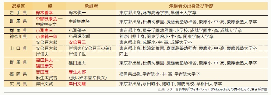 また「永田町の常識は世間の非常識」と言われていますが、世襲議員の増加は世間の常識を知らない政治家を生み出し続けている可能性があります。首相経験者(下表の赤文字)の一族をみると、選挙区は地方にありながら、承継者のほとんどが生まれも育ちも東京の一等地で私立一貫校卒というように、世間一般から見れば非常に特殊な環境で育っており、非常識が承継されている可能性が高そうです。