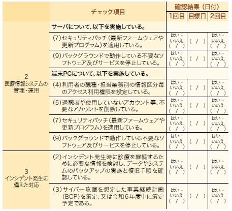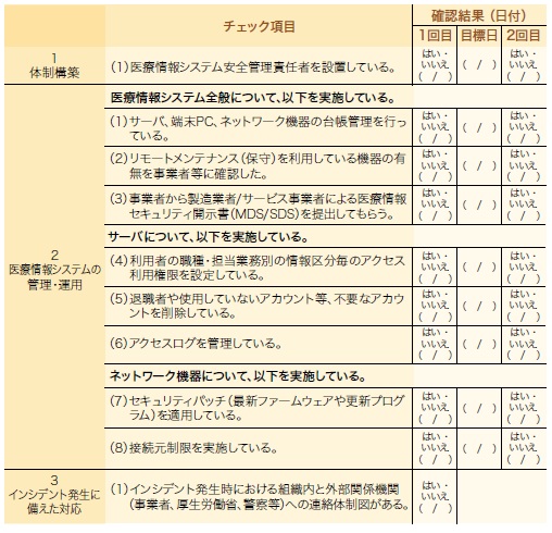 システムエンジニアなどの情報システム担当者を備えていない医療機関などでは、予防が最重要の対策になります。まず厚生労働省が策定した「サイバーセキュリティチェックリスト」による自院の状況把握をしましょう。