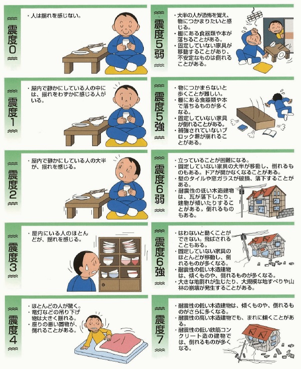 震度とゆれの状況は下図(出典:東京消防庁Website)のように分類されますが、緊急地震速報(警報)を見聞きしたら、周囲の状況に応じてとにかく慌てずに、まず身の安全を確保しましょう。