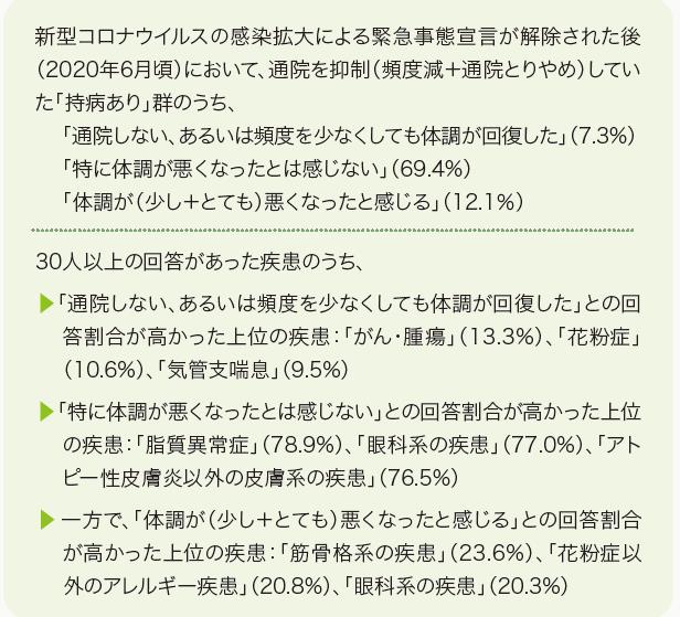 多人数の「持病あり」の方を対象とする受診抑制による影響の効果測定は、通常時は困難でしょう。Withコロナ時代は当面は続きそうです。アカデミアの方々には「禍を転じて福と為す」となるように、受診控えの影響に関する研究に積極的に取り組んで頂きたいと思います。
